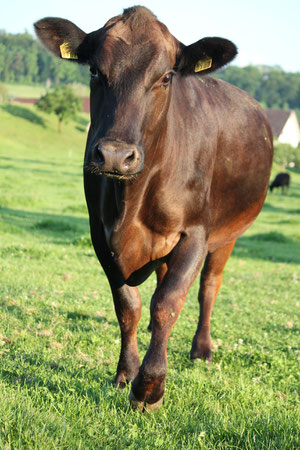 Bei den Mutterkühen, welche sie auf unserem Betrieb antreffen, handelt es sich um eine Kreuzung aus Schweizer Braunvieh und Angus. Die Merkmale dieser Kühe ist einerseits ihre dunkle Färbung, welche sie fast schwarz erscheinen lässt. Zusätzlich sind diese Tiere genetisch hornlos.